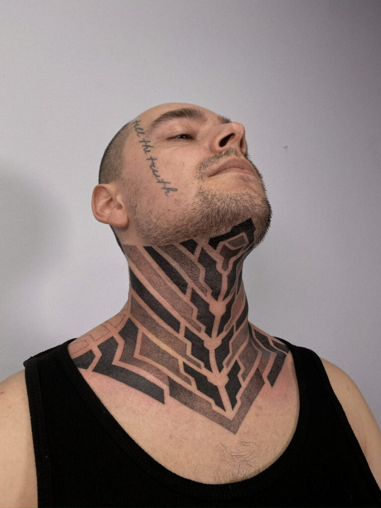 Starke Schwarzarbeiten mit geometrischen Mustern, Symbolen oder großflächigen Designs.